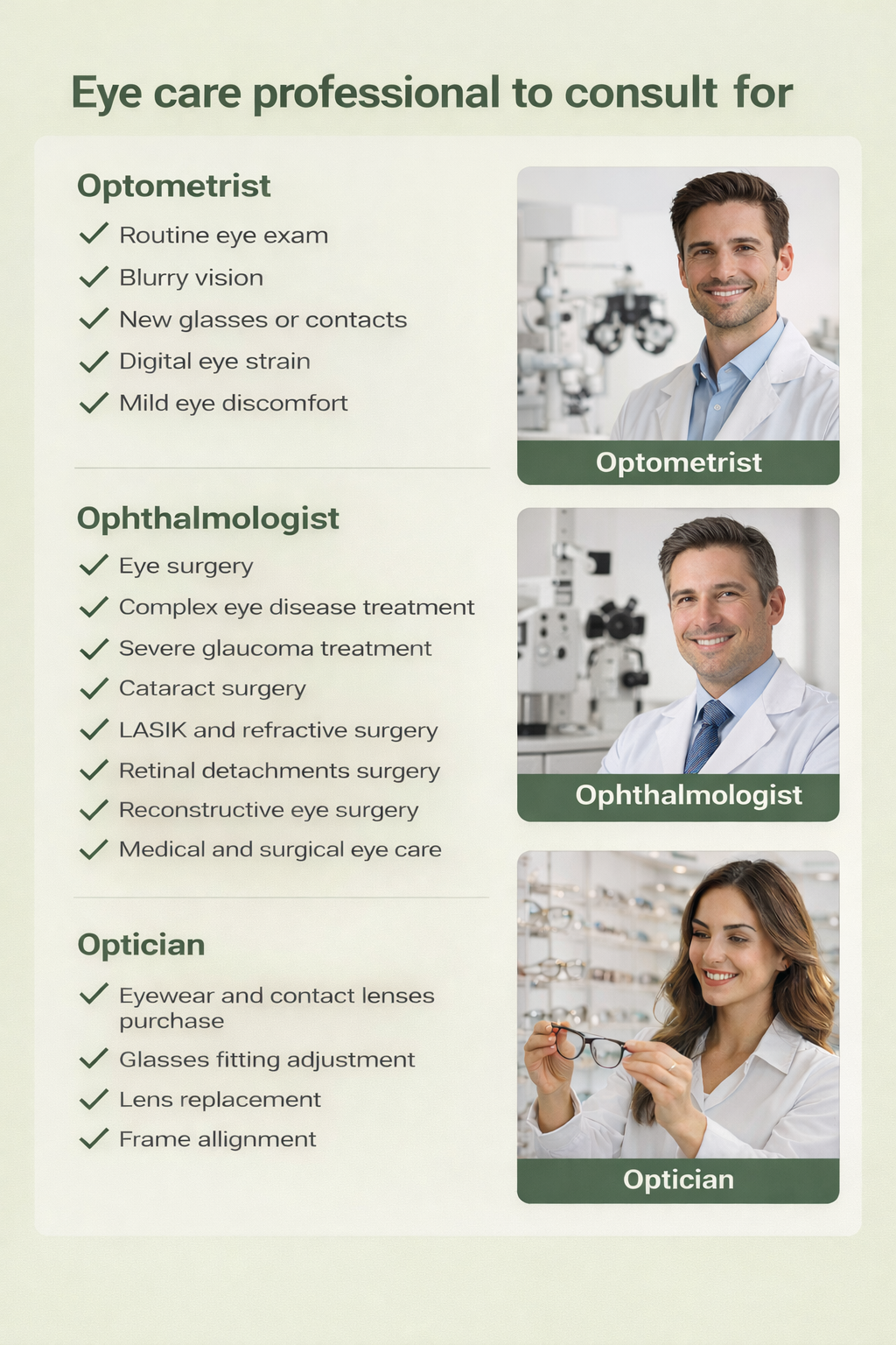 | Best for | Routine exams, vision correction, early disease detection | Surgery, complex diseases, severe conditions | Fitting glasses and lenses |